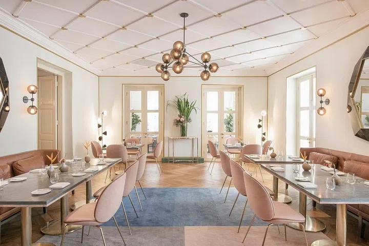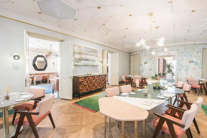 Timber flooring, ornate plaster ceiling moulding and gold trimmings are combined with marble-topped tables, upholstered chairs in muted colours and customised patterned rugs. Wall murals that give the restaurant a fresh and fun look were created by local artist Messymsxi, while the crockery and vases were made by local ceramist Studio Asobi.