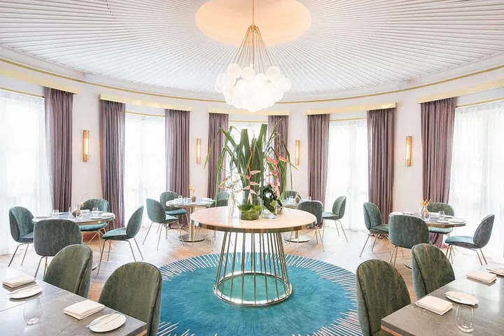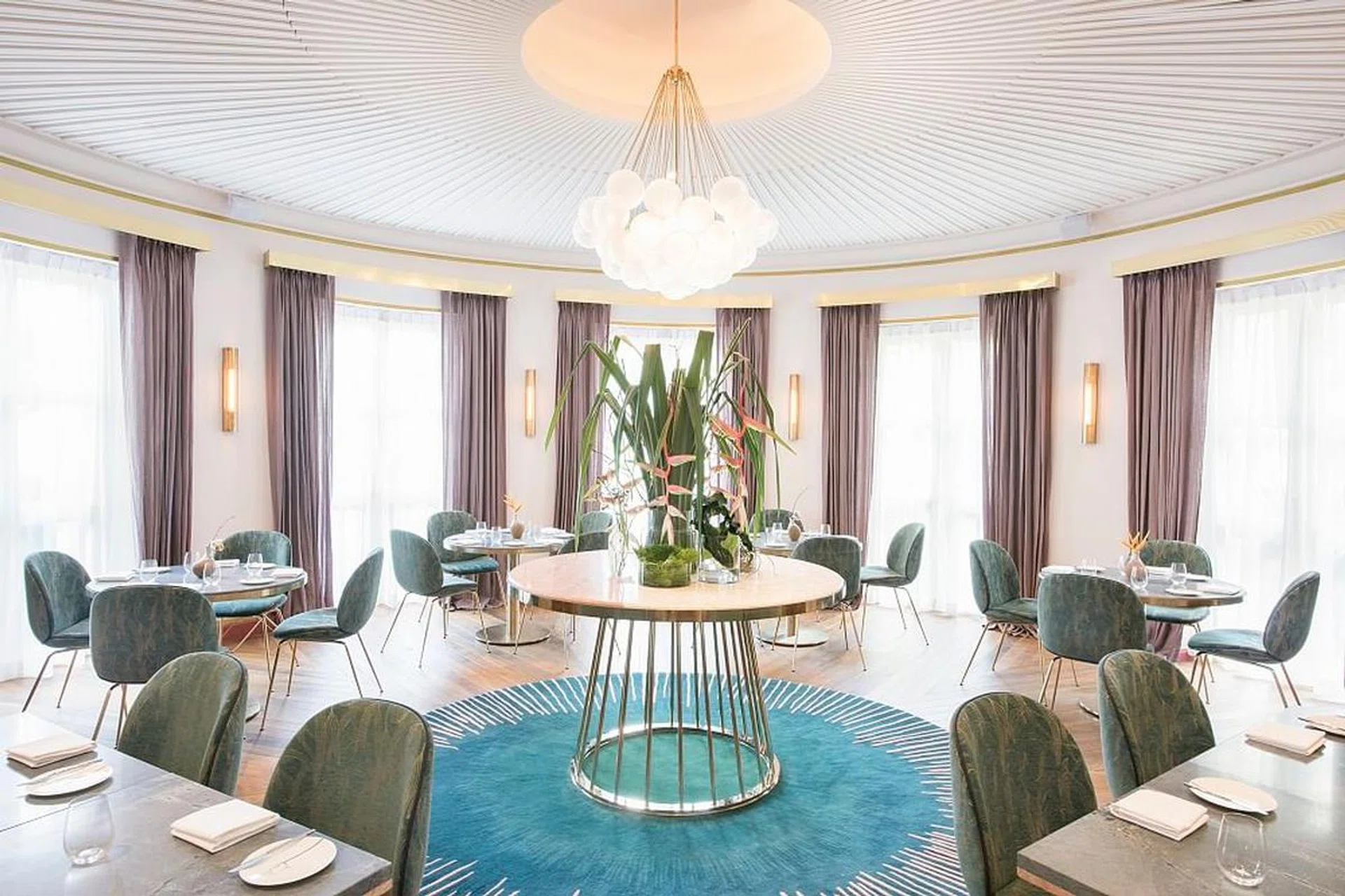 Designed by Singapore-based design studio Takenouchi Webb, the restaurant’s interiors consists of three adjoining dining rooms centred around a nature-inspired theme. It features a colour palette of pinks, greens and blues in both pale, dusty shades and vibrant hues, for subtle contrast.