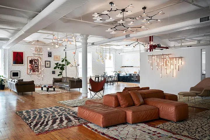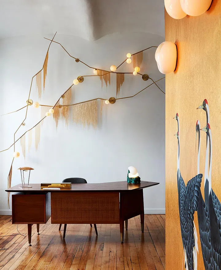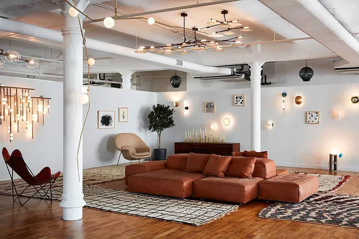 Adorned with artworks by Tanya Aguiñiga, Fred Sandback and Robert Rauschenberg, the welcoming showroom – which comprises flexible lounge and seating areas – features Adelman’s handmade lighting pieces.