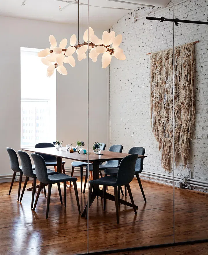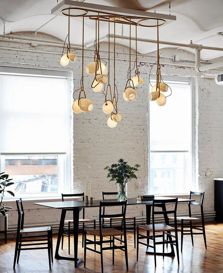 “Our studio’s signature aesthetic was born with the release of our very first product: the Branching Bubble chandelier, which combines the organic nature and blown glass with more rational, machined components,” she says. “Since then, we have explored that visual tension throughout a range of products and disciplines.”