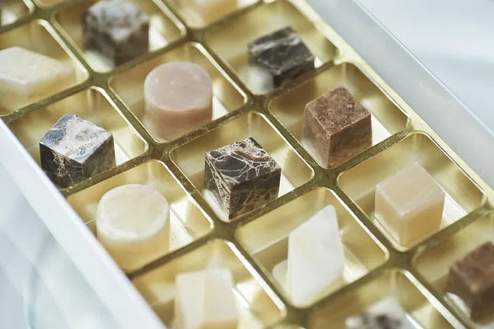 Marble sample displayed like chocolate for The Marvellous Marble Factory installation.