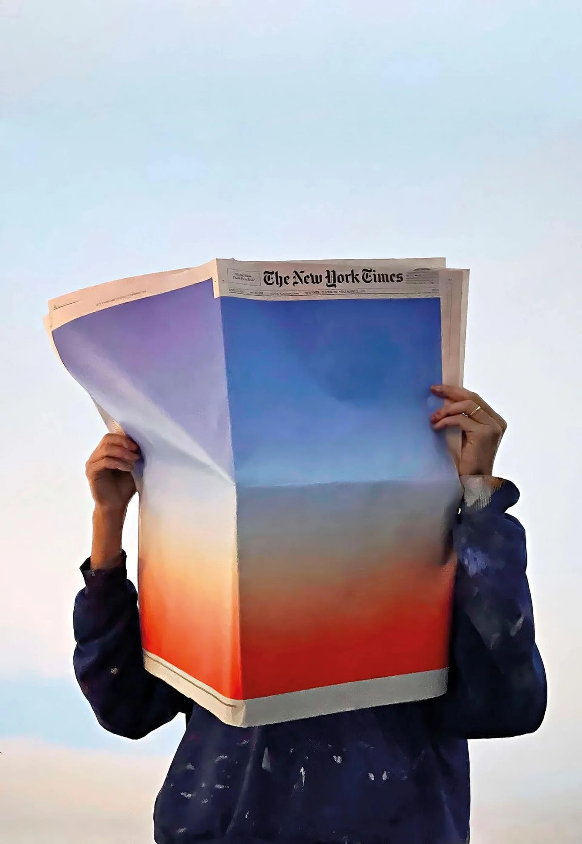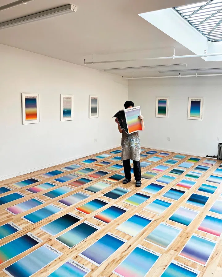 ”I started painting in 2016 after feeling inspired by On Kawara’s Today series. I painted small pieces daily after work, which led to my first exhibition at a gallery in New York. Life as a designer was very satisfying, but after I began the Sunrise series on The New York Times covers, I felt I should dedicate my time to this. It creates more meaning in my life.”
