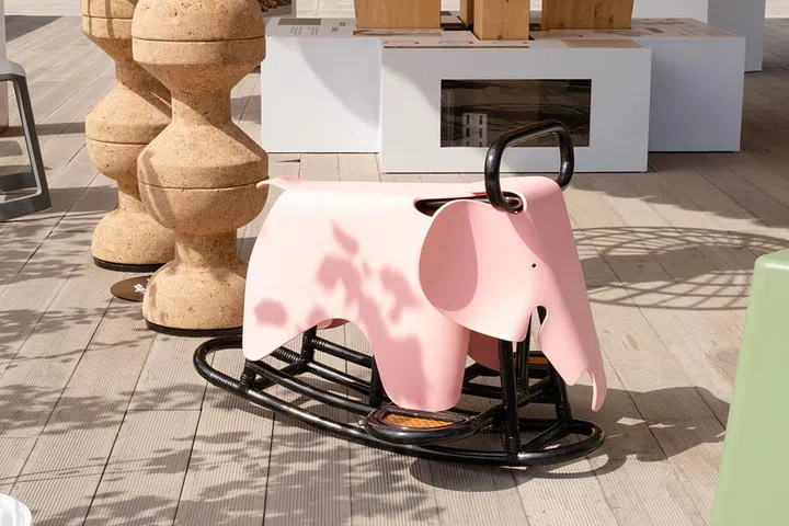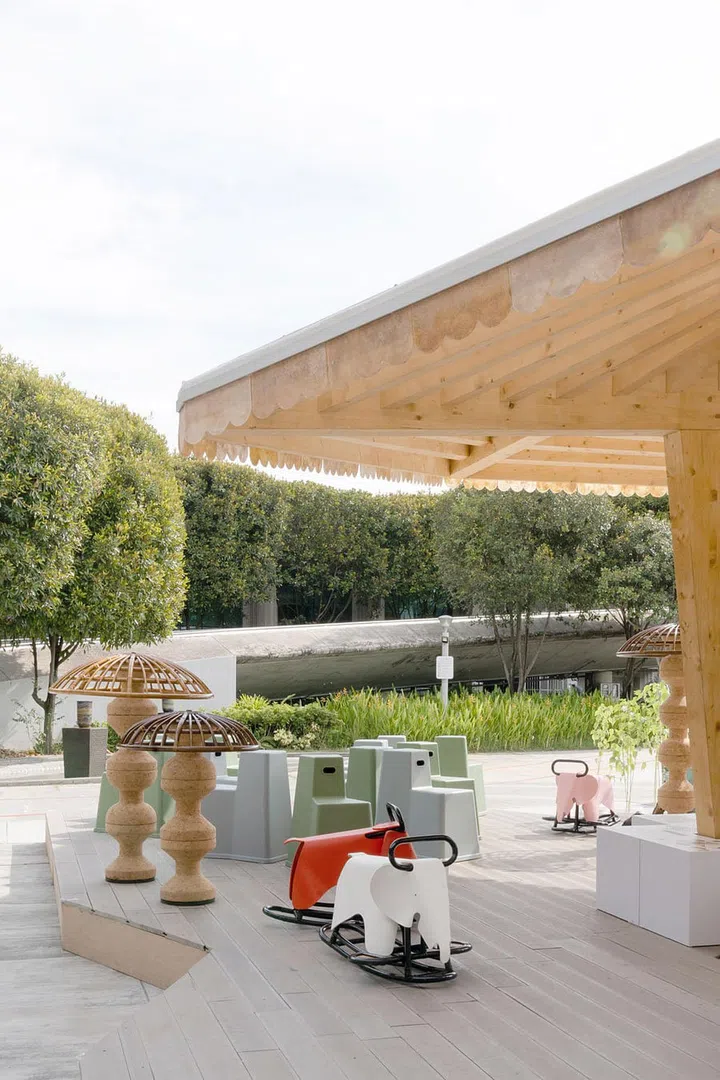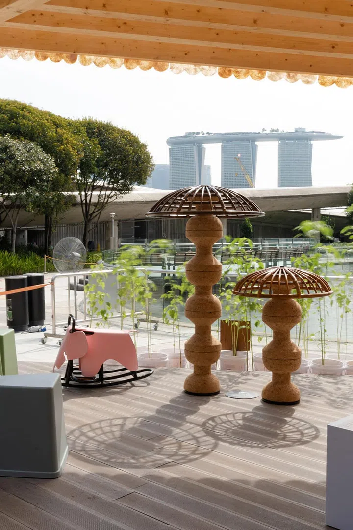 The +Pavilion showcases a vignette of a sustainable built environment with both new and traditional materials. We hope to educate visitors about sustainable construction methods like using prefabricated glue-laminated timber structural members (Haring Timber Technology) and modular off-site bolt and nut systems (Hilti) for platform construction. We also hope to arouse the curiosity of young ones by creating a whimsical play with sustainable materials. By grafting modern iconic furniture pieces (Vitra) with rattan additions, we wish to showcase the furniture in a new light.