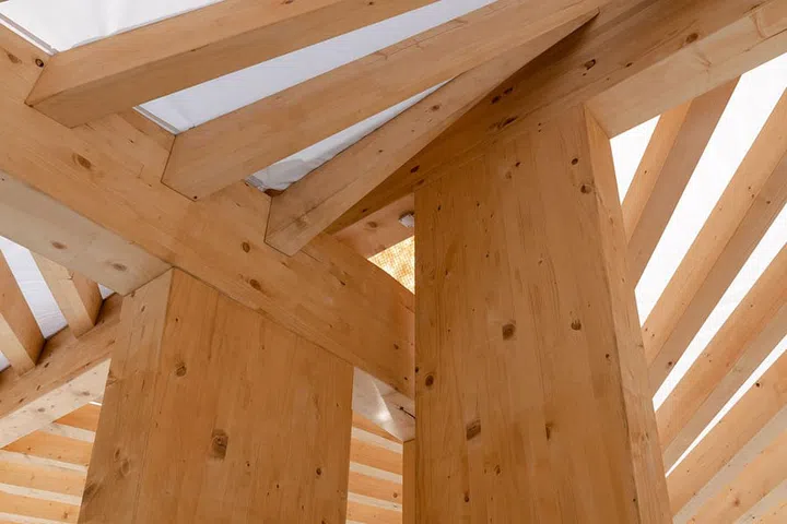 Timber construction comprising glue-laminated timber (Glulam) and cross-laminated timber (CLT) reduces our carbon footprint and is renewable compared to concrete and steel. The high strength and stiffness of varying grades of timber laminations enable glulam to freely span across large distances and be able to take lateral forces when stacked. We could achieve more than a five-metre-long cantilever to support the roof in +Pavilion.