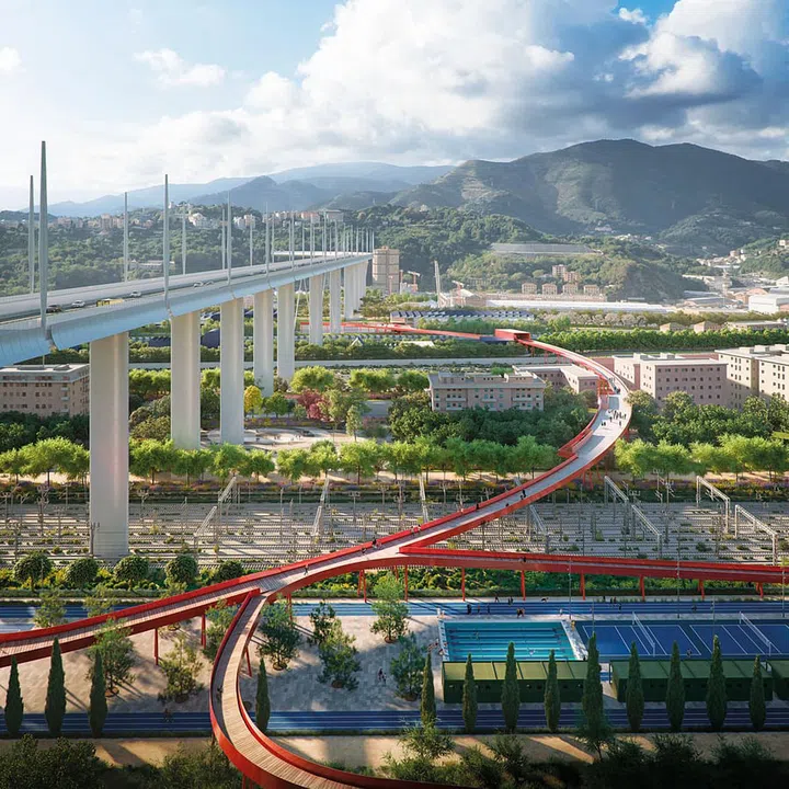 An aerial view of Polcevera Park and the Red Circle, a winning proposal for a sustainable regeneration master plan in Genoa, Italy, that was co-created by Stefano Boeri Architetti, Metrogramma Milano and Inside Outside of Amsterdam.