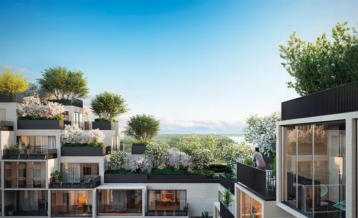 A rendering of the facade of Nanjing Vertical Forest in spring.