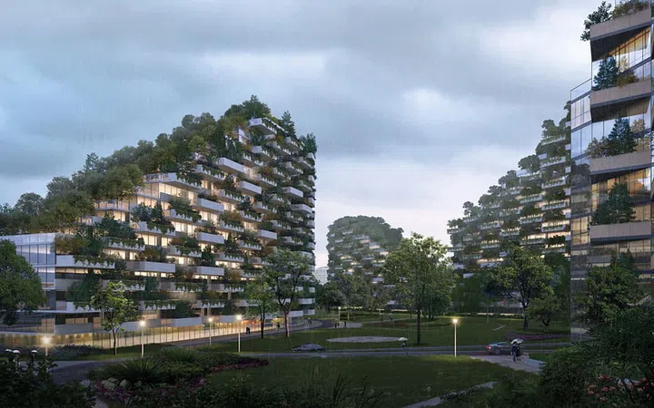 Liuzhou Forest City. Housing 30,000 inhabitants, the 175ha city in southern China proposes offices, houses, hotels, hospitals and schools covered by 40,000 trees and 1 million plants of more than 100 different species.