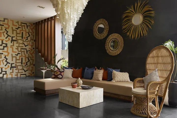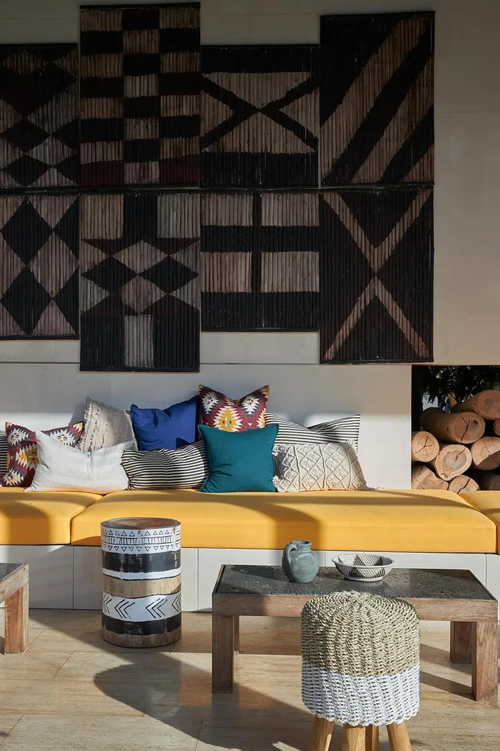 The interiors mix tribal patterns and animal prints in a warm colour palette comprising greens, earthy tones and terracotta.