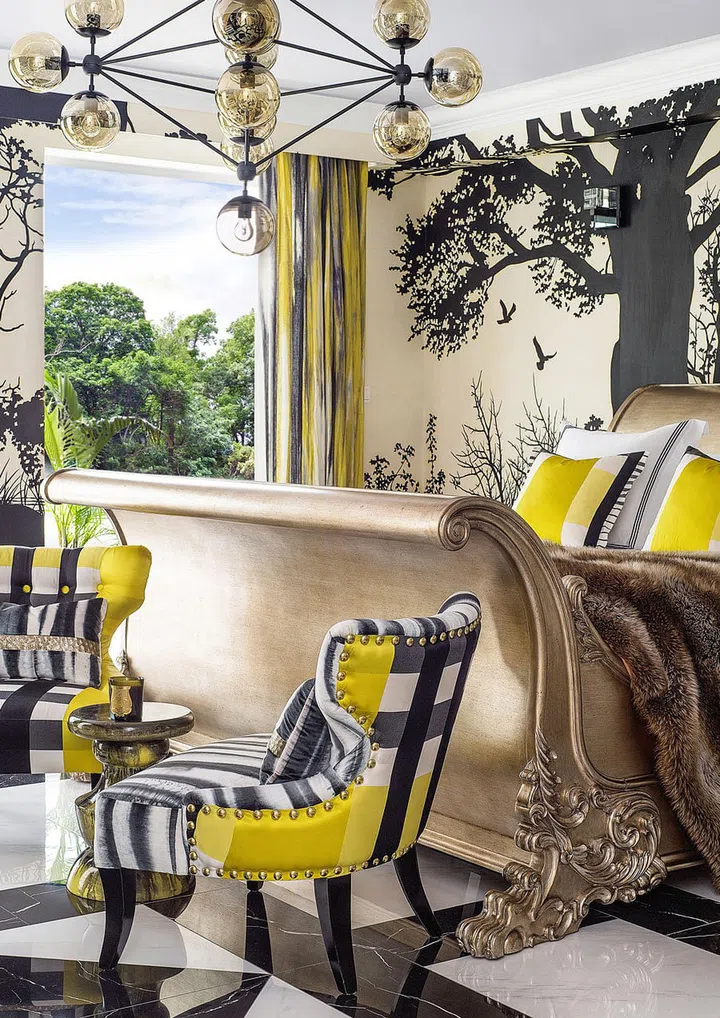 This maximalist bedroom balances bright yellow with black and white, and keeps its many textures in gold and brown to keep the palette cohesive.