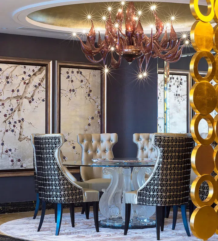 This dining room mixes many eras, featuring baroque glass table and chandelier, textured dining chairs and oriental floral paintings.