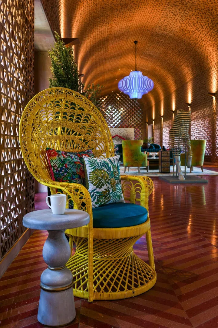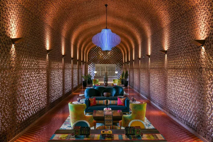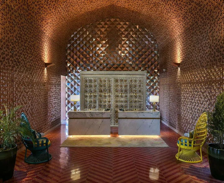 The lobby consists of long, triple-height archways with terracotta-pigmented GRC creating a lattice-like effect that gleams like jewels as sunlight streams into the interior decked with plush furniture with Rajasthani motifs and deep solid colours that contrast with the terracotta walls.