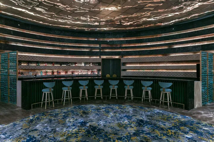The Mandala bar sets your cocktails on neon-lit tables while you’re blown away by the thikri ceiling.