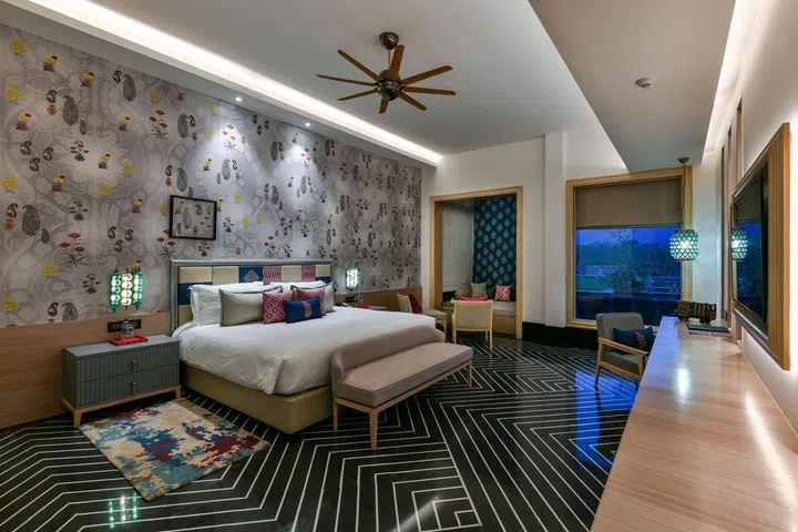 The Devi Ratn has five types of guest rooms, all of which feature a rich, eclectic palette inspired by traditional Rajasthani crafts, including thikri (hand-cut mirror mosaic) walls, terrazzo floors inspired by tie-dye motifs and paisley prints.