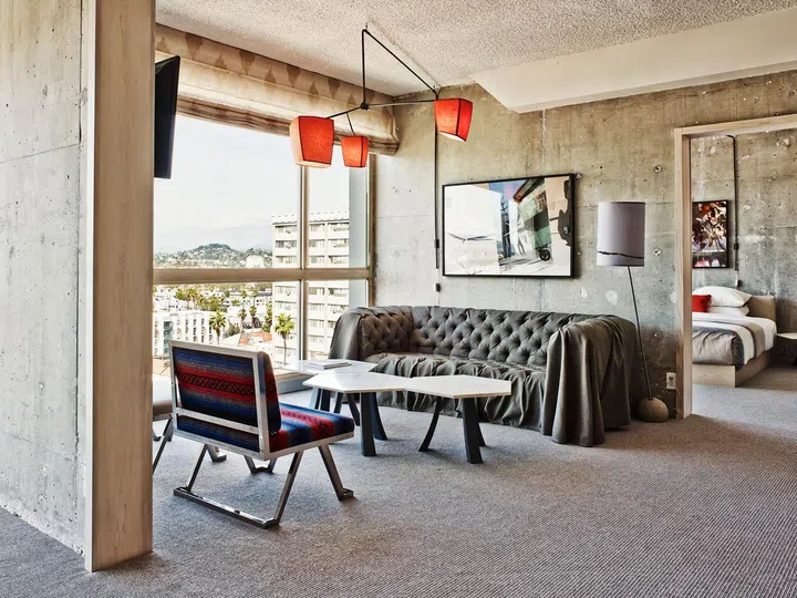 The 388 guest rooms — including studios, suites and apartment suites — feature raw materials such as concrete walls with handmade furniture created by Sean Knibb and original watercolour artworks by Claire Oswalt, among other artists. Floor-to-ceiling windows offer views of LA’s fascinating skyline.