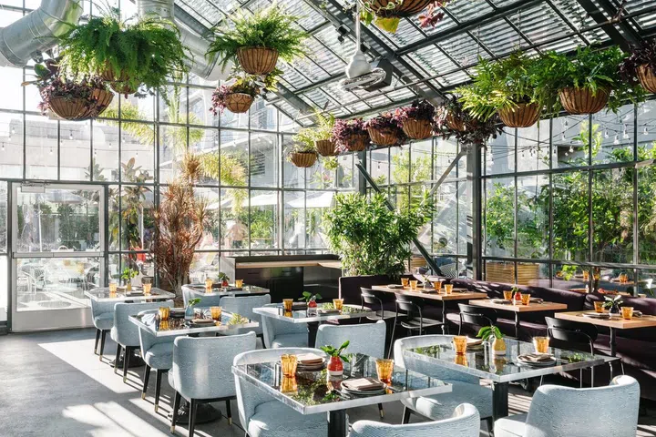 Surrounded by plants like Jerusalem jasmine and rose geraniums, and adorned with glass walls and ceilings, Openaire on the second floor was created in collaboration with Josiah Citrin, a chef with two Michelin stars. Knibb furnished the space with burgundy mohair banquets, a marble bar with mirrored backsplash accents and custom marble crates housing liquor and aperitifs. Outside of the restaurant, the outdoor pool is a true urban oasis, open all year round.