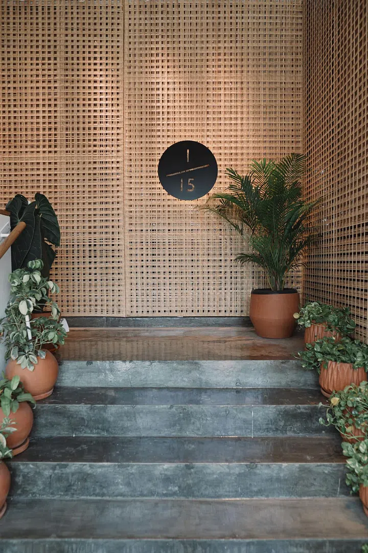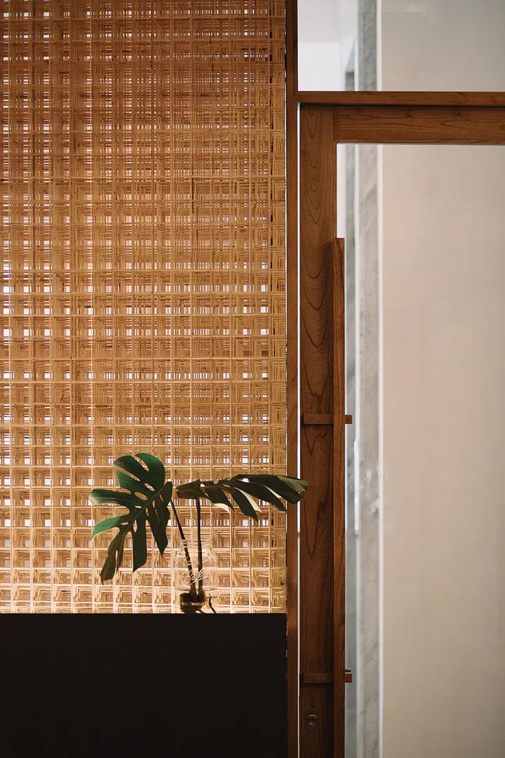 The rattan concept also unifies the outside with the interior. The full-height screen in the lobby made of synthetic rattan with a bespoke weave pattern constructed from a series of overlapping grids suggests depth and shifting perspectives.