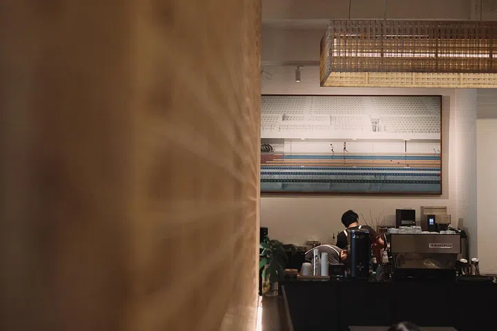 Off to its sides, a series of smaller ones hangs above the banquettes, bathing the space in a golden hue and casting a shadow play that makes for a unique coffee drinking experience.
