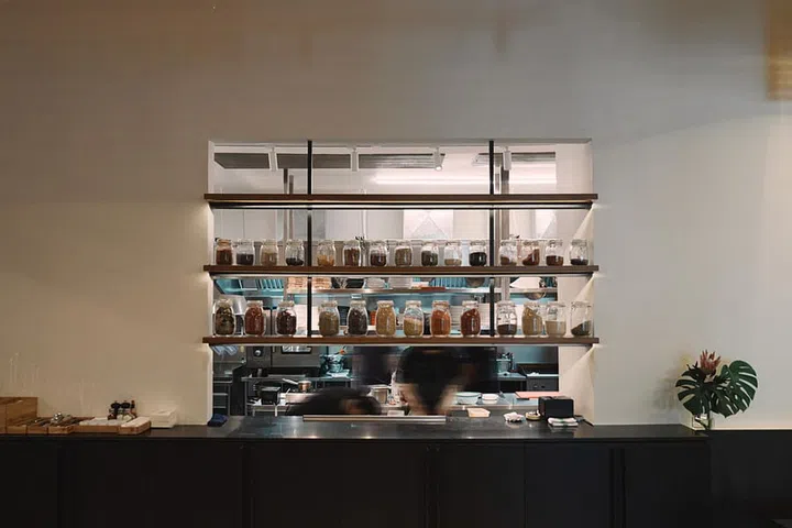 It offers a glimpse of what’s on the other side as diners are presented with the theatricality of coffee making and food preparation via a wide opening in the far wall, separated only by open shelves lined with jars of condiment and spices.