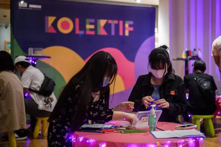 Decked out in colourful tables, bean bags and fairy lights, The Gallery’s space has been transformed into a restful pitstop amidst the bustle of the Civic District. As part of an experimental programme, KOLEKTIF Takeover invites youths to reflect on their state of mind through interactive workshops that explore contemporary questions, from learning the art of letting go to finding brief getaways from life’s everyday stressors.