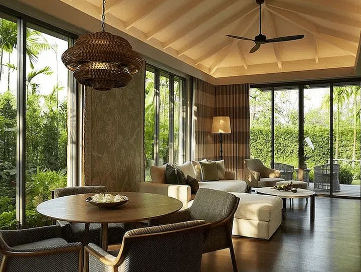 Traditional architectural elements and accents—think Thai silk bed throws, embroidered pillowcases and oriental carpets—underscore the focus on natural elements.