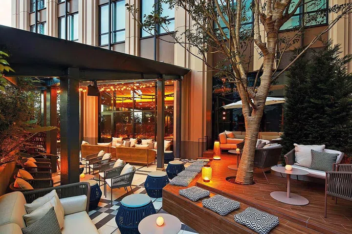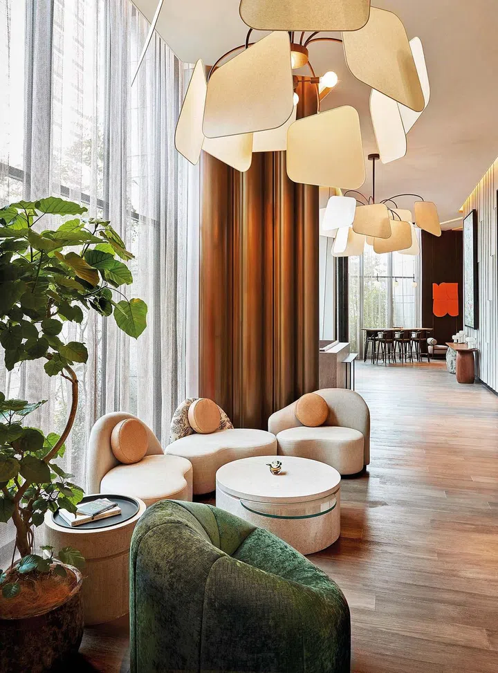 Sculptural plaster walls and a 3D folding wall welcome guests and visitors in the lobby, also the location of The Jones Café Bar, an all-day chill New York City (NYC)-inspired spot adorned with lacquer tables, an eclectic mix of chairs, oversized sofas, reclaimed material turned art pieces and striking neon industrial accents against a backdrop of indie music.