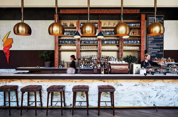 On the second floor, District, a modern brasserie that’s open from brunch to dinner with a bar lounge for many happy hours, has rich blue plaster walls, aged brass detailing, a show kitchen, wood-on- wood inlay tabletops, leather banquettes and artworks.