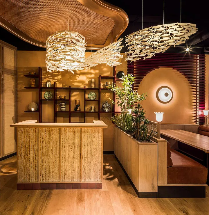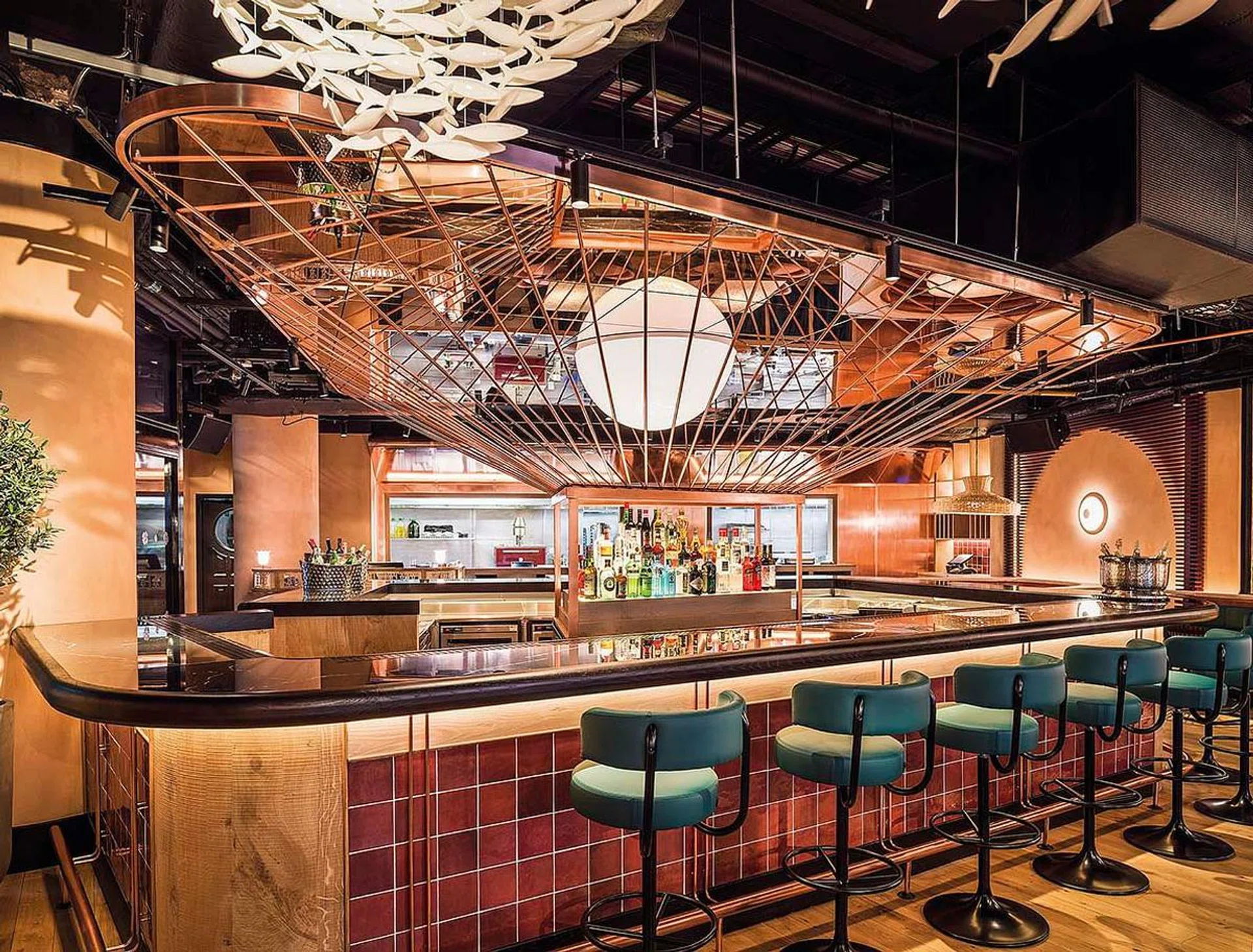 Using a backdrop of light oak floors, rose-coloured handmade tiles, and limed oak joinery, the studio introduced dramatic elements like a cascade of globe lights and schools of ceramic fish by Scabetti that swim overhead as diners gather below.
