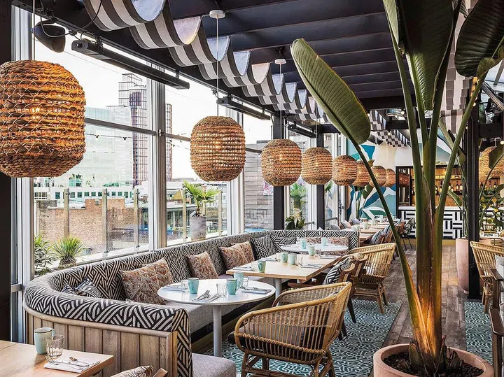 At Christina’s, the ground floor café bar, an arched copper bar and large hand-painted mural by artist Fred Coppin dominate the double-height space. These are accented by pendant light fittings designed as a reinterpretation of the gasoline lanterns that used to be London’s street lights.