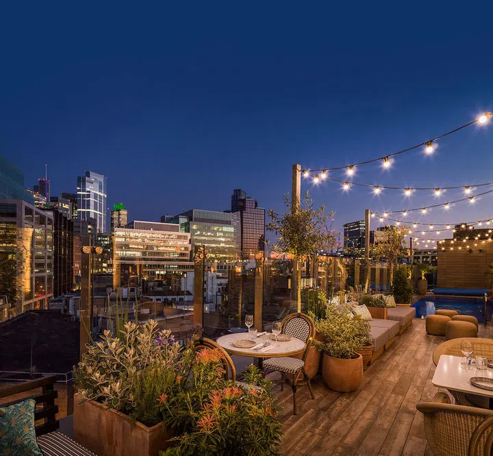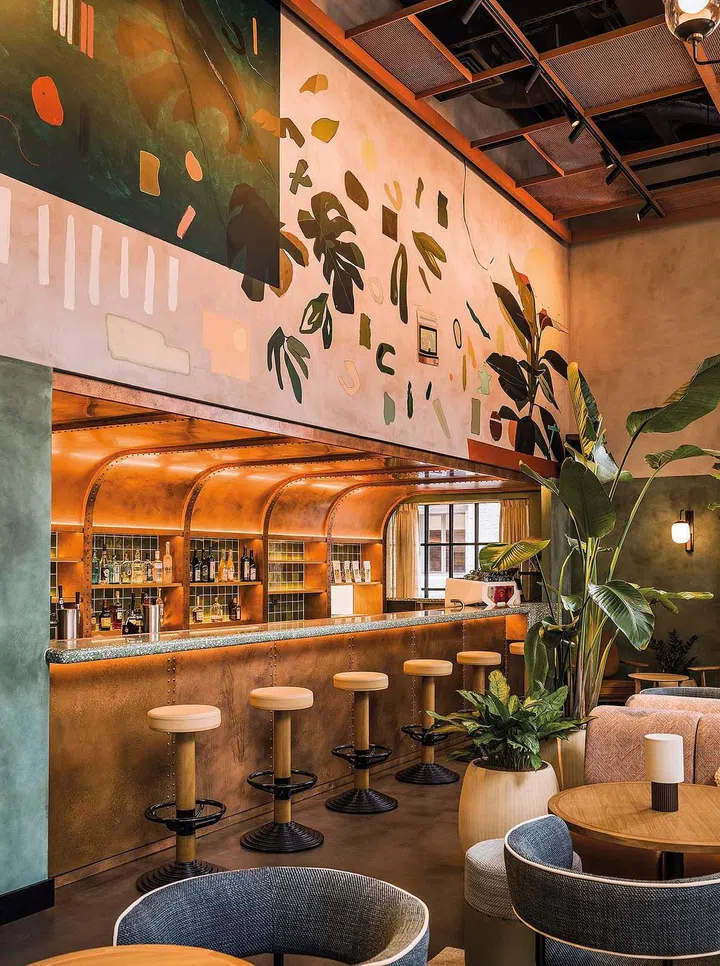 The rooftop bar Altitude at the Curtain provides a cosy yet vibrant atmosphere with its oversized rattan pendants, cane furniture, and abundance of greenery. The plants, curated by local planting company Conservatory Archives, lend bright cheer during the day and privacy in the evenings between groups of diners. Here you’ll find another mural, this time painted by Lucy Robinson, who led the interior design team for the project.