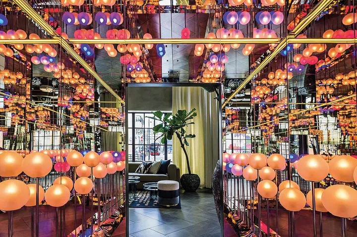 Playful expression is abundant in every part of the hotel. Art pieces line the reception and lobby, including a circular neon art piece and gilded glass panels that depict a rising sun. As homage to artist Yayoi Kusama, Goddard Littlefair also created a fully mirrored room where guests see infinite versions of themselves, a tongue-in-cheek design touch that invites people to examine the self in the moment.