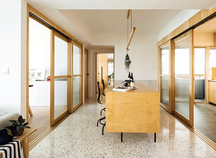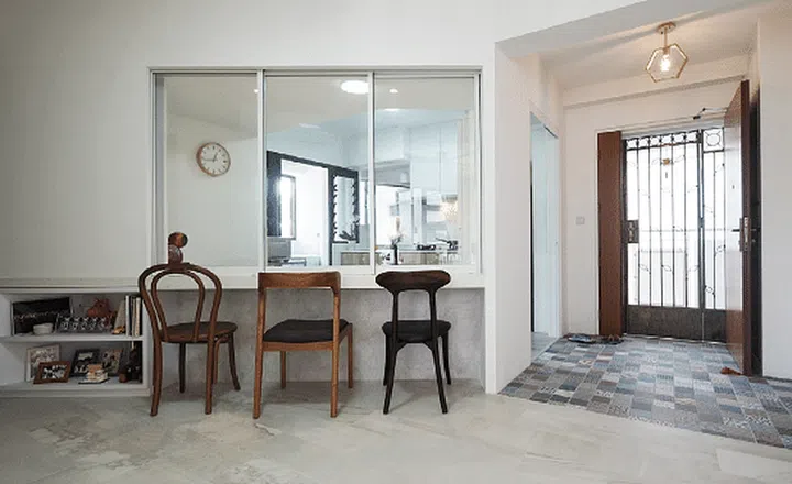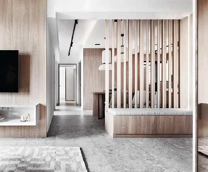 Home to a chef, who wanted an open-concept kitchen, his wife and their young daughter, Wee Studio reconfigured the orginal BTO layout to seamlessly combine the living room and kitchen, leaving half of the dining area visible through wooden slats that divide the latter and the entrance walkway with seating and shoe storage. Having such an open environment is the easiest way to make the most of natural light.