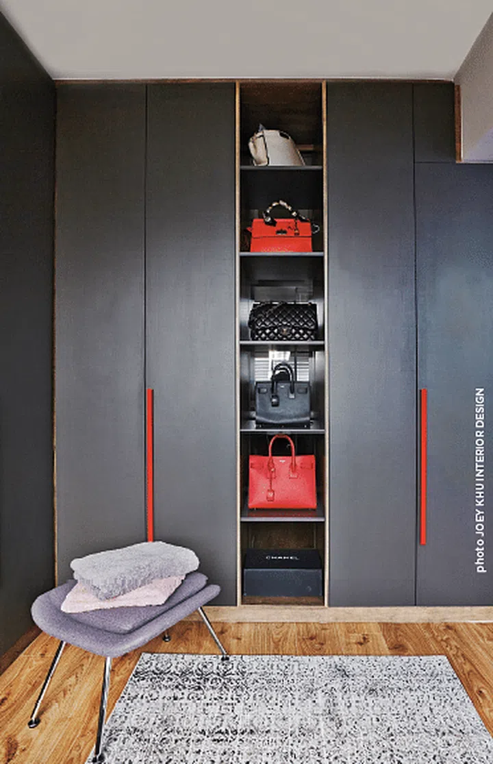 Not only did interior designer Joey Khu of Joey Khu Interior Design create sufficient space for a walk-in wardrobe by merging the master bedroom and an adjacent bedroom, he also left pockets of space in the wardrobe to allow the homeowner to neatly showcase her handbag collection.
