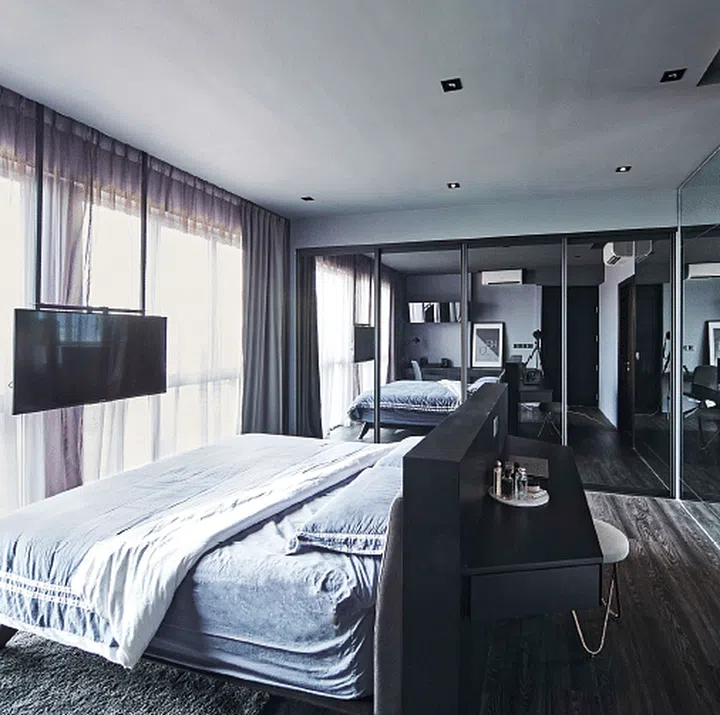 Designer Sherlynn Low of Millimeters Studio created a bold look with all-black interiors for her home. She also adopted an unconventional layout in her master bedroom by incorporating a headboard-cum-dresser design more often seen in hospitality projects.