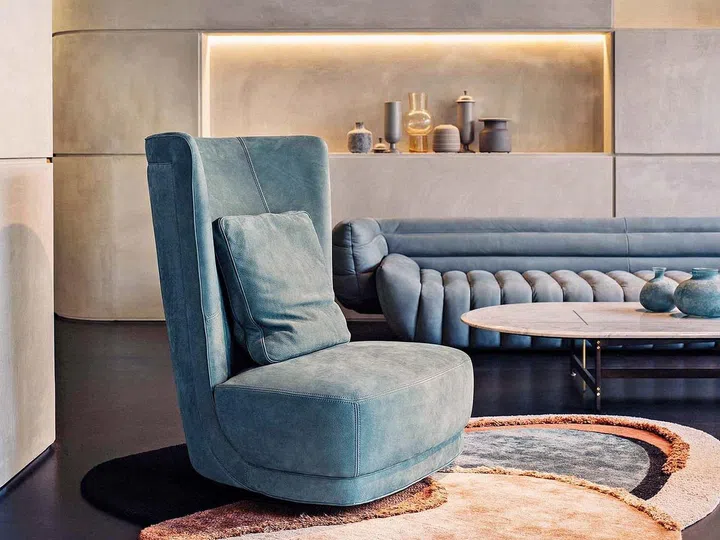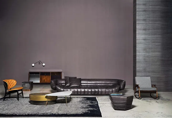 What comes to your mind when you hear the words “leather furniture”? At Baxter’s display in Space Furniture, it takes different forms, ranging from an oversized Chesterfield sofa to a shaggy stool in Mongolian lamb leather and a graphic armchair that hardly looks like it’s upholstered in leather.