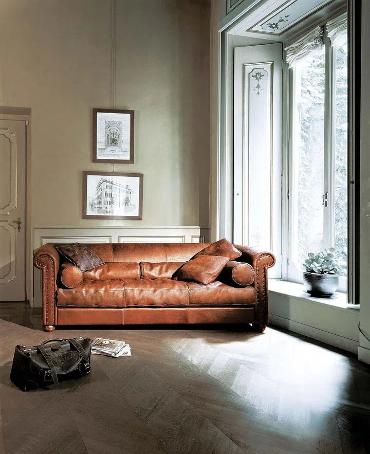 These correspond to three time periods. The first is the Alfred Sofa by Marco Milisich. It was the first item that we gave a deliberate lived-in character to that has a little vintage touch.