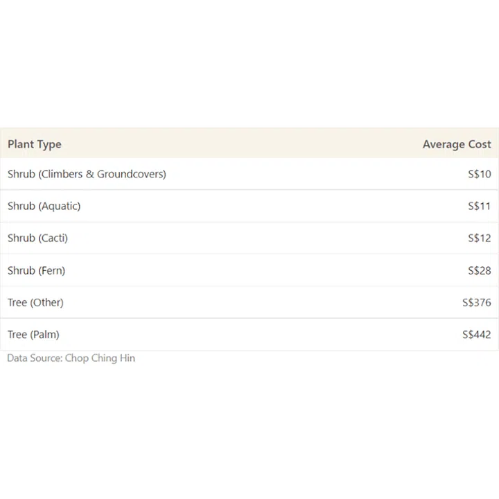 Typically, large trees will cost the most, ranging from $5 for saplings to a few thousand dollars for mature varieties. Smaller shrubs like ferns and ground covers are much cheaper, typically costing S$10-S$30 per plant.