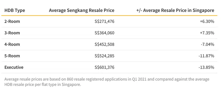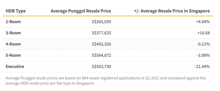 As of Q1 2021, Punggol's 4-bedroom, 5-bedroom, and Executive HDB flats are lower than the average HDB prices in Singapore. If you're interested in securing a large flat for yourself or your family, then Punggol's current resale prices are great value deals. While an Executive flat has the largest cost difference among HDB flat types in Punggol, it's important to note that they barely account for 0.01% of total units based on resale registered application volume and therefore may be hard to come by. However, if you are able to get your hands on a Punggol Executive flat, then you'll be able to save an average of 21.44% in resale value — which is the best deal found amongst all 3 estates.