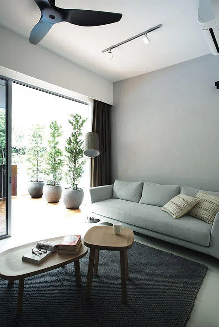 12. One way to make a narrow balcony comfy is by decking it out with an L-shaped outdoor sofa that’s of the right proportions. Place it to face inwards so that relaxing outdoors can still interact with those in the living room. (Interior design by The Orange Cube Pte Ltd)