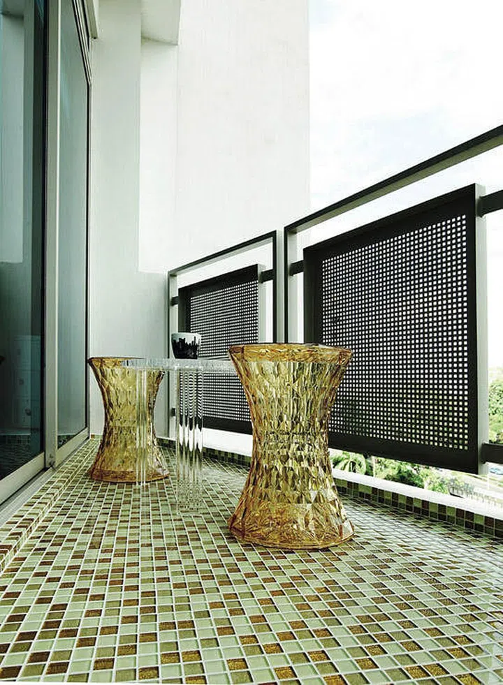 3. While awkwardly shaped balconies may be restrictive in terms of furniture arrangement, you can play up its floors by cladding it with vintage mosaic tiles and giving it a retro spin! (Interior design by Free Space Intent)