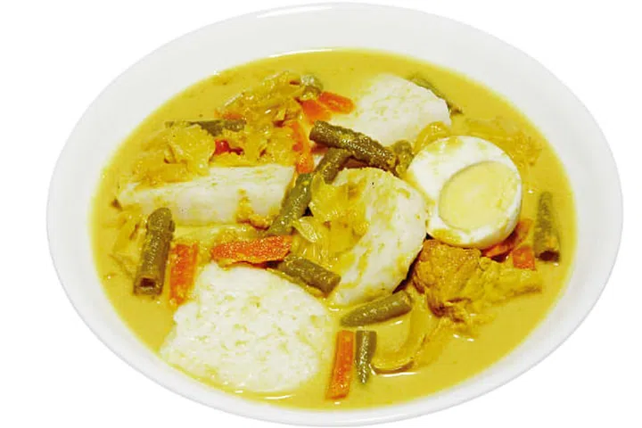 Lontong originated in Java, Indonesia. It's basically a coconut curry stew (sayur lodeh) with vegetables and rice cakes. This dish is commonly vegetarian, though you should always ask your local Muslim food stall if they cooked the soup with any shrimp stock.