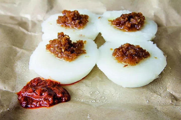 These white rice flour cakes are often paired with chopped preserved radish, or "Cai Por" in dialect.