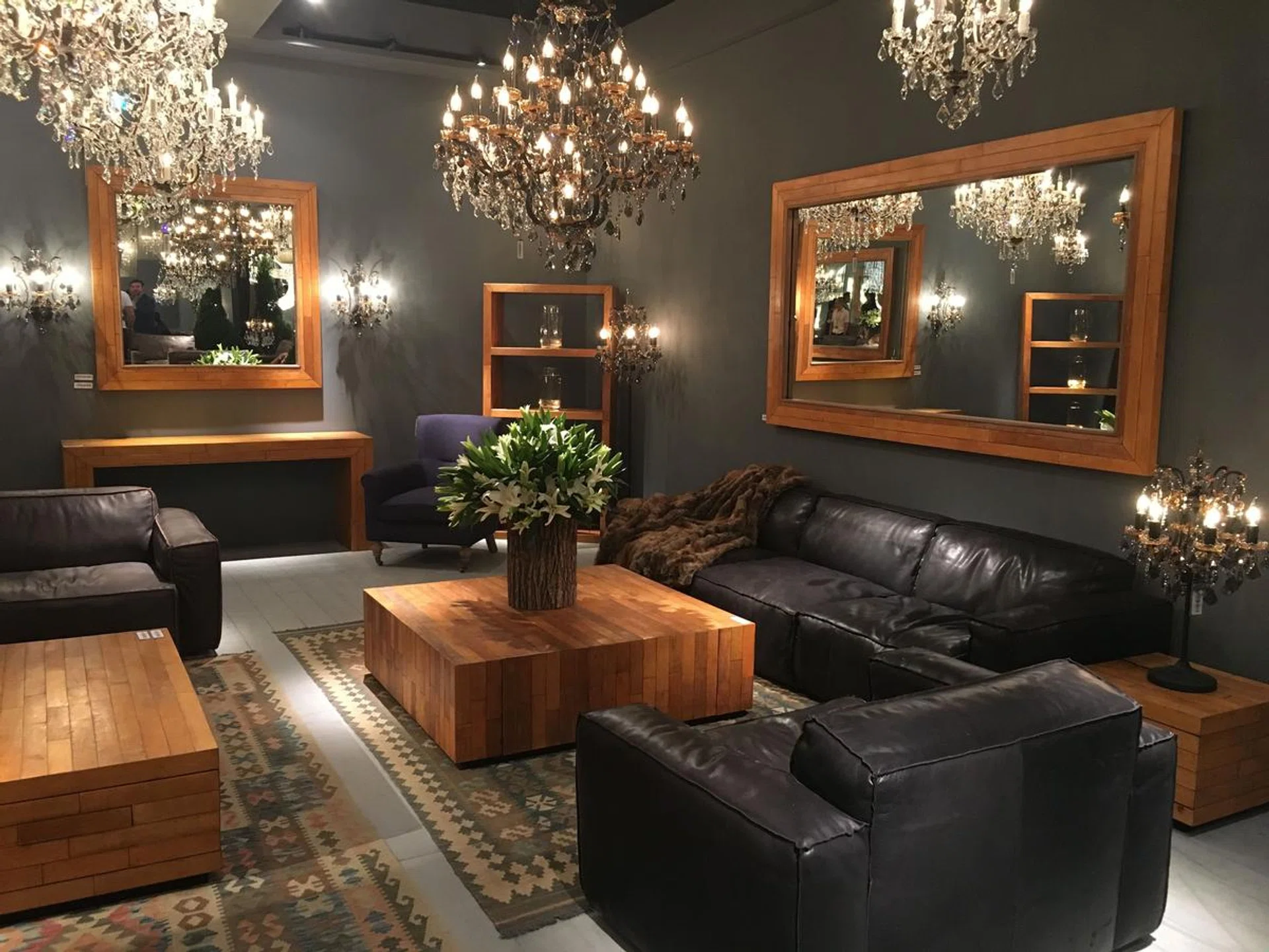 1) Mix glam, ornate pieces (such as the gold-tone chandeliers) and slouchy or rustic pieces (such as the reclaimed wood tables and leather couches) for a look that is effortless stylish.