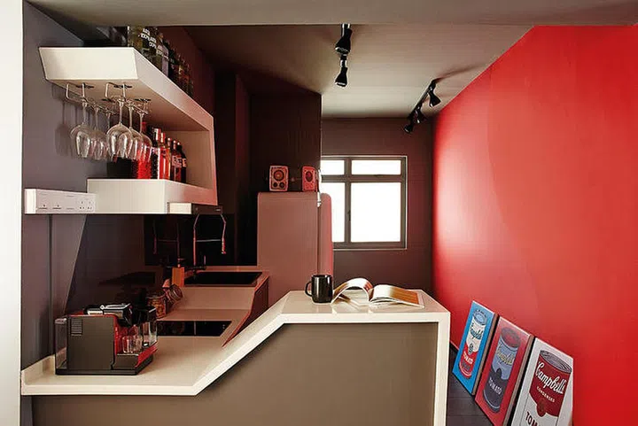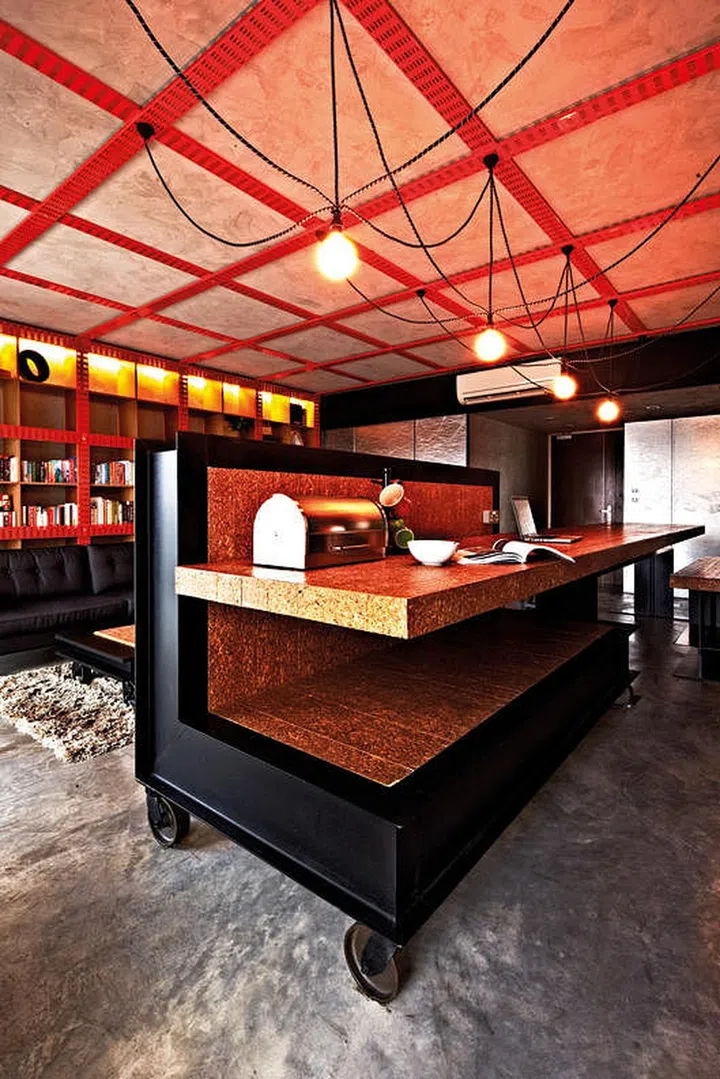 For the design of this customised kitchen island cum dining table, the designer used steel beams for the L-shape frame and technical wood for the surfaces — unexpected materials for the kitchen! The best part is that it has relatively straightforward construction, due to the absence of typical cabinet doors or drawers. The casters are fixed, but they give the kitchen island the effect of lightness and mobility.
