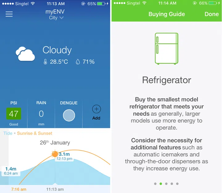 Plan your chores and schedule ahead with this app by the National Environment Agency. My ENV provides information a two-hour Nowcast based on your current location, PSI readings, the tides, and the risk of dengue in the area you're in (a red cluster means get out of there quick!). It also lets you in on the nearest hawker centres.