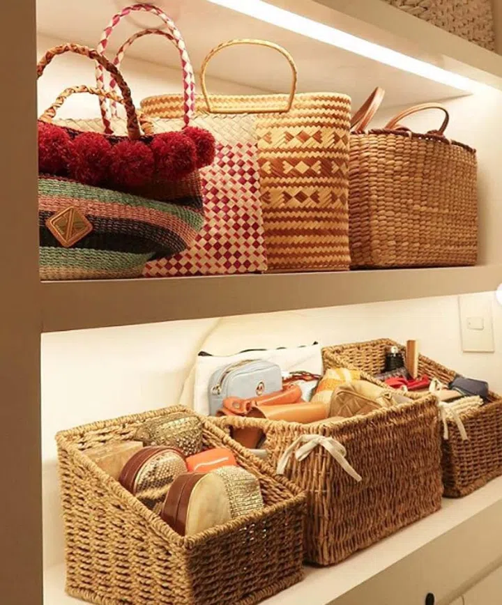 Banish clutter with woven baskets. They aren't just good for newspapers, cushions and stashing other memorabilia - wicker baskets are great for keeping your bags tidy on open shelves, and add a stylised look to your home, too.