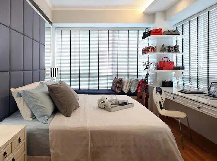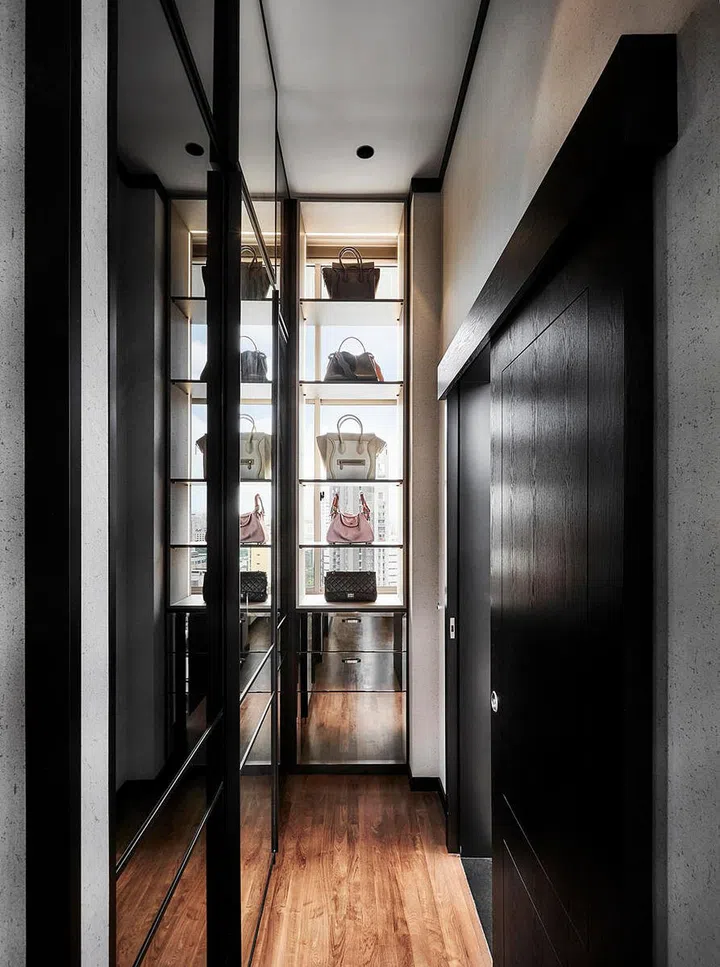A column by the bedroom window of this modern-meets-classic Bukit Timah condo was turned into a display shelving unit for the homeowner's handbags.