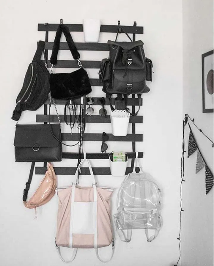 This slatted bed base was upcycled and transformed into a nifty bag and accessory display.