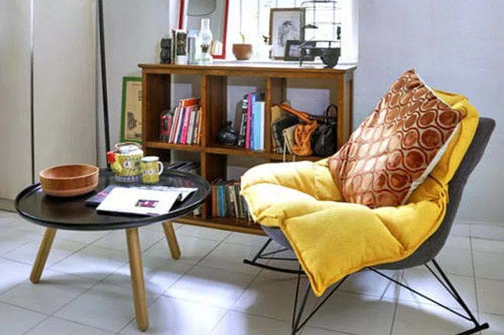 Reading area: "Mix display items that are both pretty and also functional (like the mirror). A plant or two can also help with dust. You also don’t need to get a fancy chair, just find something that’s already in the house which people won’t miss."