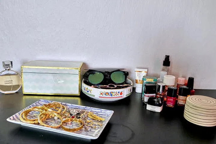 Vanity Table: “I think the best thing you can do for your makeup and jewellery area is compartmentalise and display them the way they’re meant to be worn. The rod prevents my necklaces from tangling and because they’re hanging, it helps me visualise what to wear with them.”