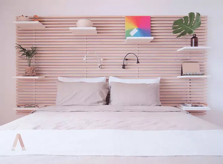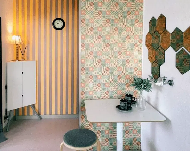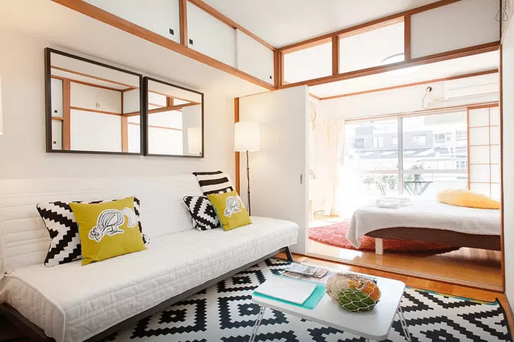 This apartment in Japan is quirky and has two styles -- a stripe-themed dark and cosy bedroom, and an airy and feminine living room (next picture).